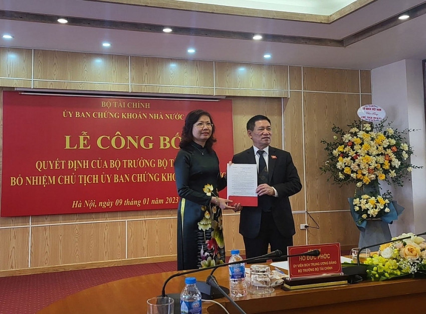 Sáng 9/1/2023, Bộ trưởng Bộ Tài chính Hồ Đức Phớc đã trao quyết định bổ nhiệm Chủ tịch Ủy ban Chứng khoán Nhà nước (UBCKNN)